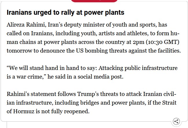 how about their entire political and religious leadership stand around the power plants bravely and leave the citizens out of it. instead of cowering behind a human shield.