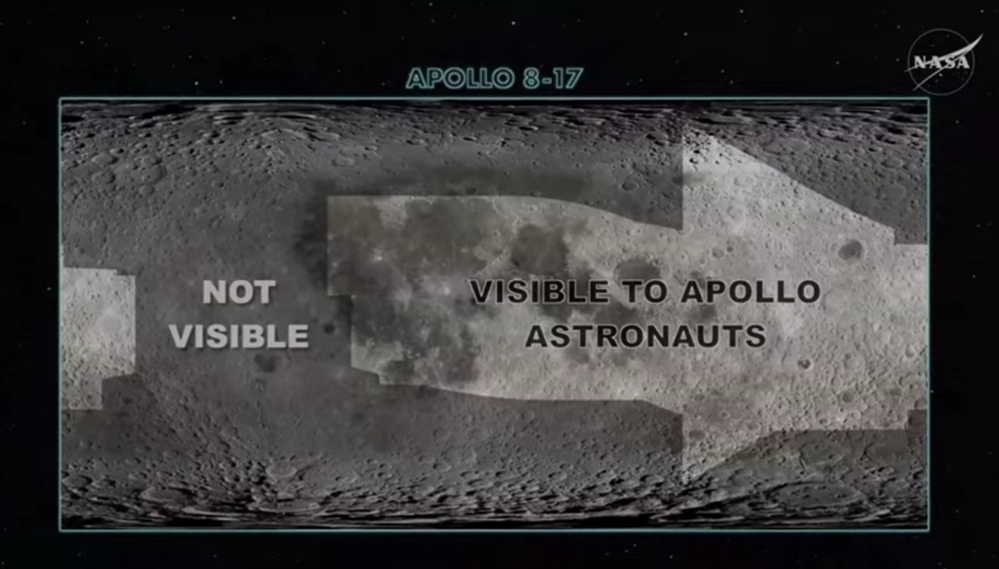 >>532592728Map projection of the Moon's surface, showing the (highlighted) areas that Apollo astronauts were limited in vision to due to those missions' low altitude orbits and landing exploration views.Dark shaded area are the parts of the Moon surface that have not been observed by human eyes, and Artemis II flys by at a higher altitude than Apollo had to allow viewing the whole Moon disk.