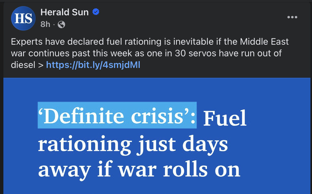 https://archive.md/OmEsy>‘No happy ending’: US President Donald Trump takes another swing at Australia. But what does he want?https://archive.md/eSoBS>NRMA urges motorists ‘go back to pre-war buying habits’ as fuel shipments secured until Mayhttps://archive.md/t8DQu>Ben Roberts-Smith arrested at Sydney Airport over alleged war crimes