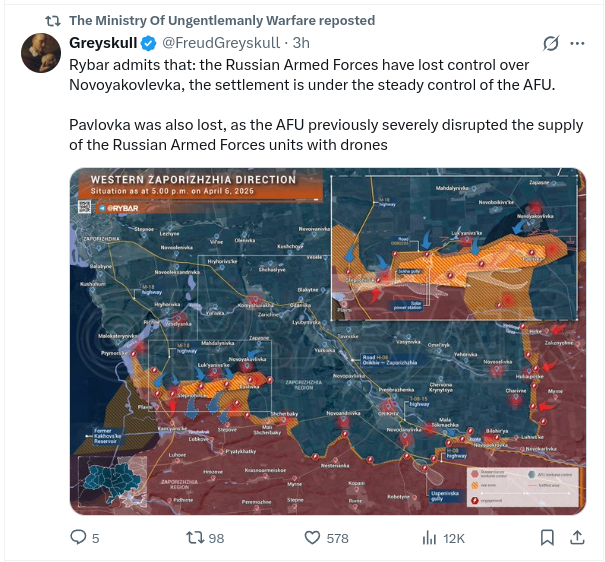 Previous: >>532572596Day 1,504 – Daily assessment: understandingwar.org/analysis/russia-ukraine/#research▶Latest>russian state propagandists that predicted a 3day SMO now admit that russia is doomed to defeat>Novopucciysk reports port attack, fires>Ukraine signs security co-operation agreements with Turkey and Syria>Ukrainian forces liberate 480 sq km on Oleksandrivka axis t. Syrskyi>Ukrainian Drone Raid Hits Two Chemical Plants in Tolyatti>Ukrainian Military Presence Reported in Western Libya Amid Expanding ‘Shadow War’ With Russia t. RFI>Russia’s Digital Gulag Caused Bank Outage>Roof of Moscow Higher Combined Arms Command School on fire>Primorsk oil terminal bombed again>Kstovo refinery droned>Moscow VE day pride parade cancelled>Russian Su-30 fighter jet crashes in Crimea>Russian Northern Fleet Contract Soldier Sets Fire to Aircraft and Armored Vehicle>Drones Strike Area of Russian Explosives Plant in Morozov, Leningrad oblast>Ufa refinery droned>Lieutenant General Oleksandr Ivanovych Otroshchenko was killed in An-26 plane crash - Six officers from the Northern Fleet headquarters were killed too>1,3 million russians eliminated in the 3-day SMO (with many more to come)>russia loses another Su-34 fighter-bomber>russian An-26 military transport aircraft lost over Crimea>for the fourth consecutive month (Dec - Mar), the “mobilized vs eliminated” balance remains firmly negative t. Magyar>Large explosion at Nizhnekamsk refinery>Ukrainian drones once again attacked Ust-Luga and Primorsk ports in Leningrad region>Kremlin Officially Denies™ incoming general mobilisation▶Telegramrentry.org/telosint2023t.me/ukr_pics▶Intelt.me/DeepStateENodin.tradoc.army.mil/WEG (equipment explorer)ukr.warspotting.net (visually confirmed losses)▶Mapsdeepstatemap.live/enliveuamap.com/en▶DISPOSABLE SOLDIER (diary of a RU mobik)TOURS 1-4: files.catbox.moe/mpcw7p.zip▶12 min of TZD in one ditch (Pokrovsk area) - 28 killedfiles.catbox.moe/sxbxfb.mp4