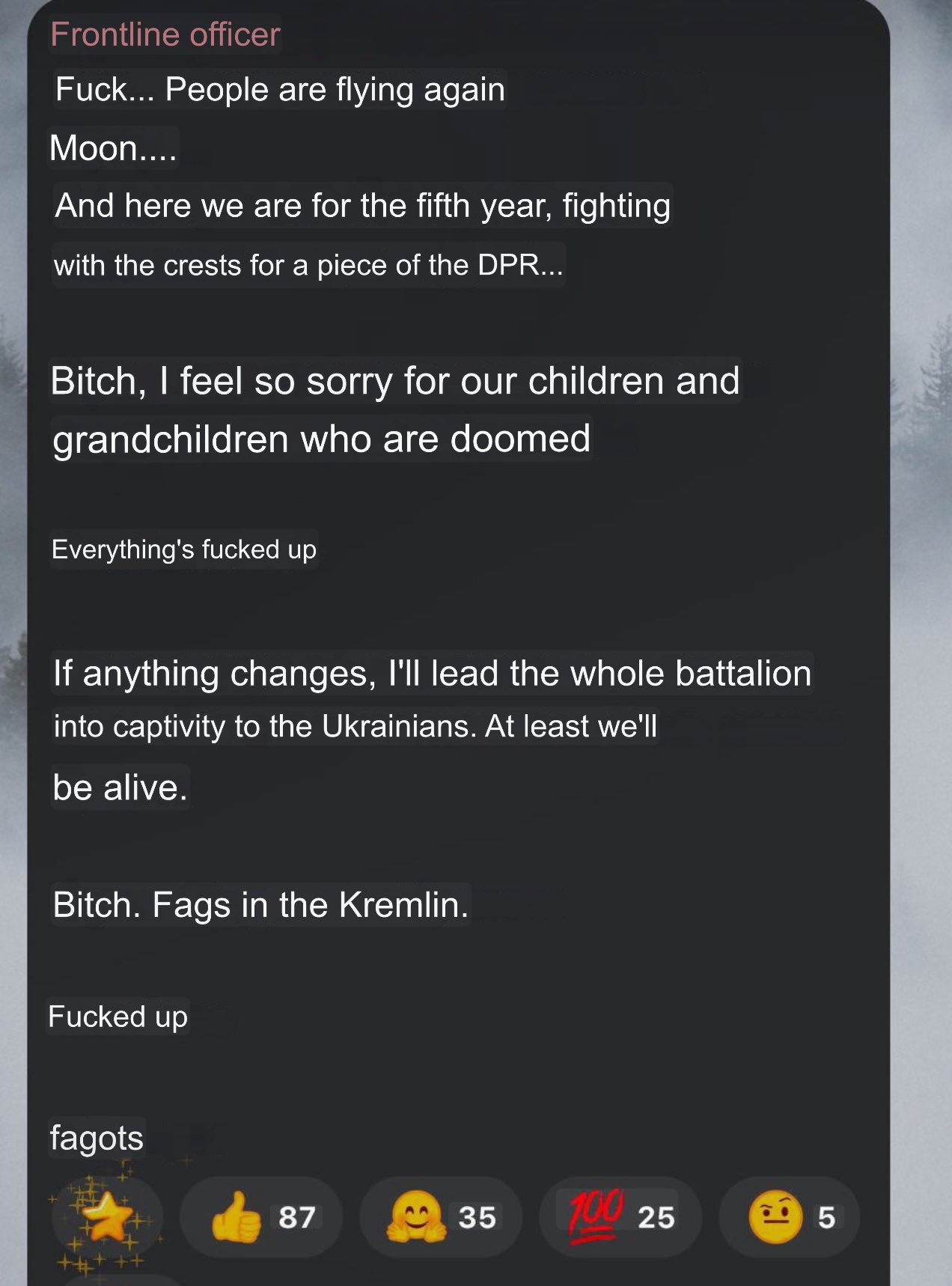 >>532605234Imagine being a russian who signed up for a conctract!>Get shipped to your unit without training>first thing you get your rifle taken away from you>next you are forced to give away any new equipment you had - sleeping bag, flak jacket, helmet — everything>next you are forced to pay to the "company funds" a.k.a. pretection money to your officers>run out of money, forced to take up debt>can't pick up any more debt, get sent to the assault unit like an old horse.