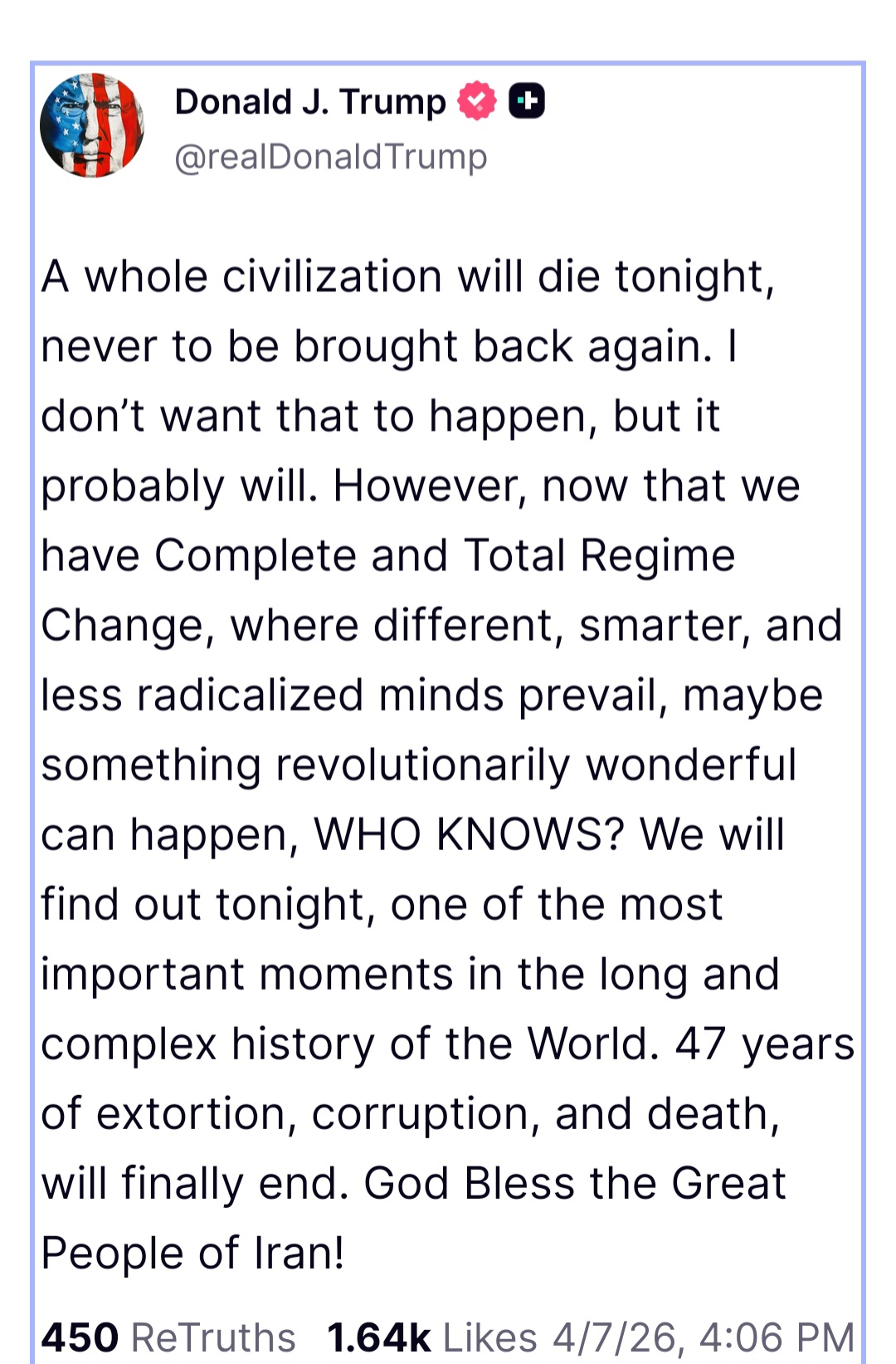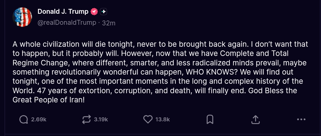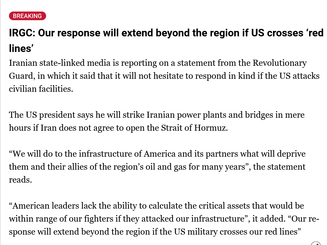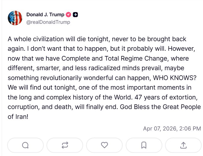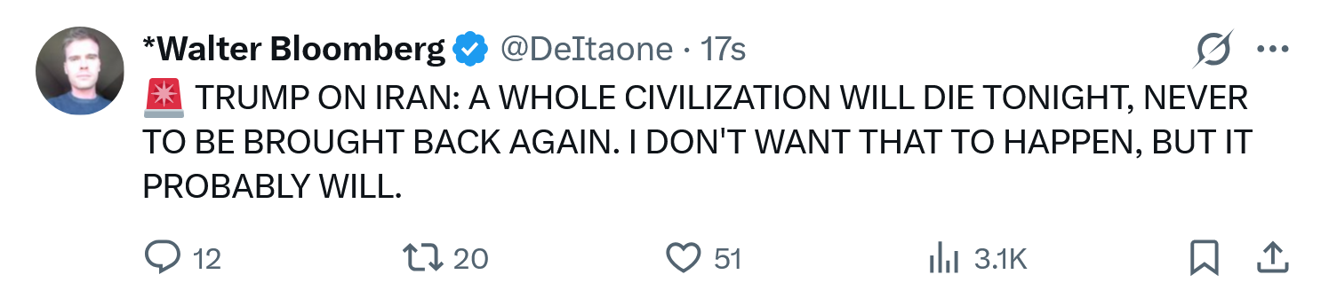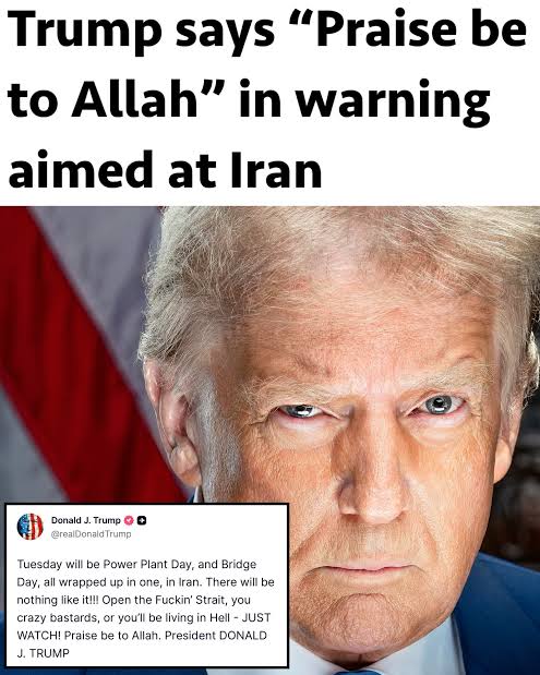 >Trump praises Allah (on Easter of all days) and "delays" his ultimatum a 5th time, to 7 April, 8 pm EST. (Truth Social).