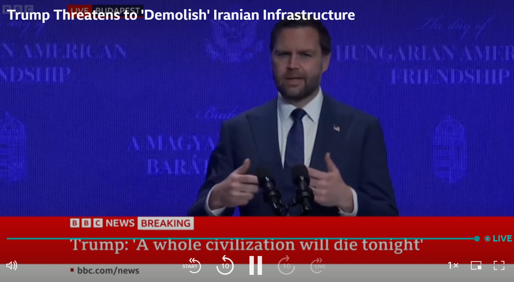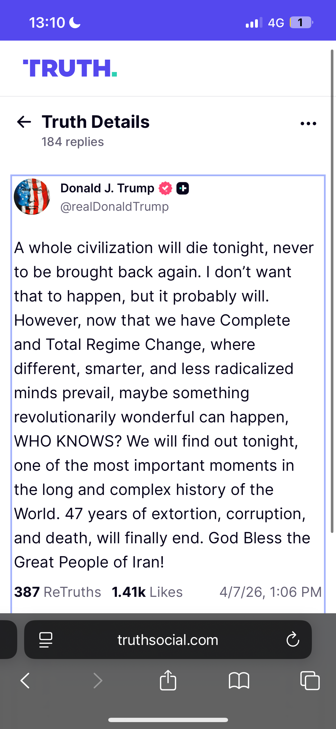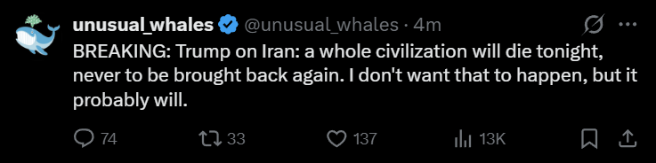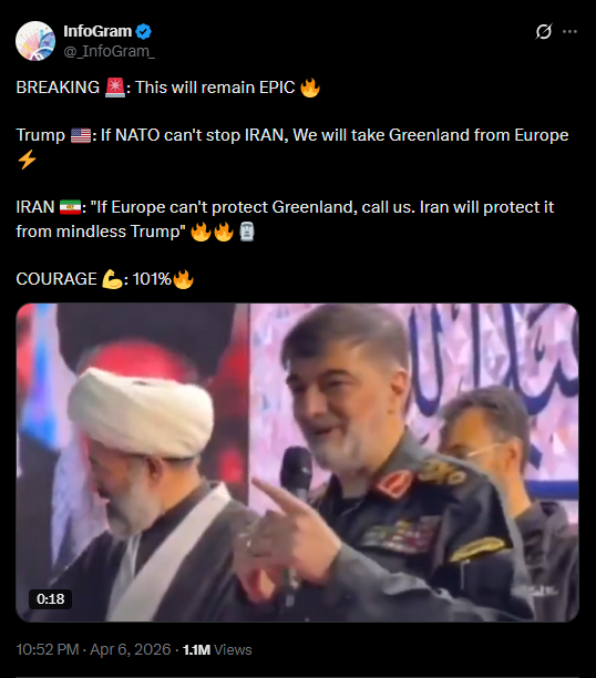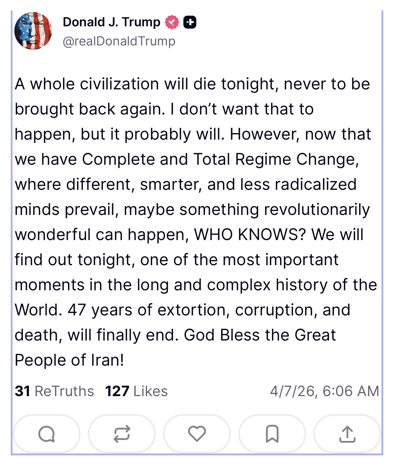 >Trump praises Allah (on Easter of all days) and "delays" his ultimatum a 5th time, to 7 April, 8 pm EST. (Truth Social).