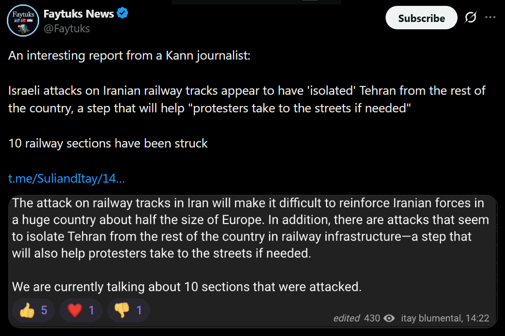 >NewBridge day updateExtensive US-Israeli strike on Iranian transport infrastructure. Among the targets are Qaflankouh Railway Bridge, East Azerbaijan province, Hashtrud-Tabriz highway, Yahya Abad Railway Bridge in Kashan city, north of Isfahan.