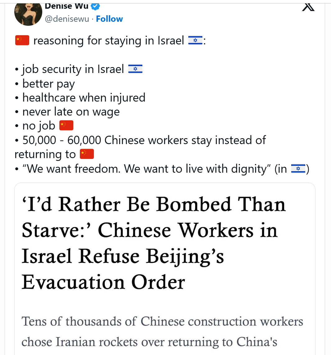 Chinese workers in Israel refuse to comply with the evacuation instructions of the Communist Party: "I would rather die from a bomb than die of hunger" Tens of thousands of Chinese construction workers in Israel refused to comply with the Chinese Communist Party's evacuation order from March 2026, and chose to remain at work sites within firing range of Iranian rockets instead of returning to the collapsing labor market in China. The workers' refusal, documented in videos that quickly spread on social media, is a public rejection of the economic situation within China."I'd rather die from the bomb than die of hunger,"said one of the workers. Another put it more sharply: "We want freedom."We want to live with dignity.'