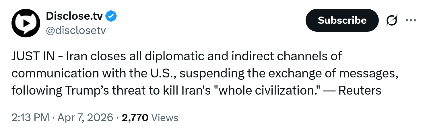 >BREAKING: Iran cancels all diplomatic and indirect channels of communication with the United States and announces the suspension of message exchanges, following Trump’s threat – ReutersDoesn't that mean they will no longer negotiate and it's all out war?