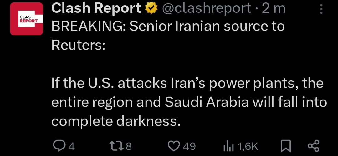 BREAKING: Iran has announced that it will destroy the entire energy infrastructure of Israel and all other countries that host US bases in the region:“WARNING: From now on, certain considerations regarding good neighborliness and self-restraint have ended. We will deal with the infrastructure of the United States and its partners in the Persian Gulf in such a way that they will be deprived of the region's oil and gas for years.”