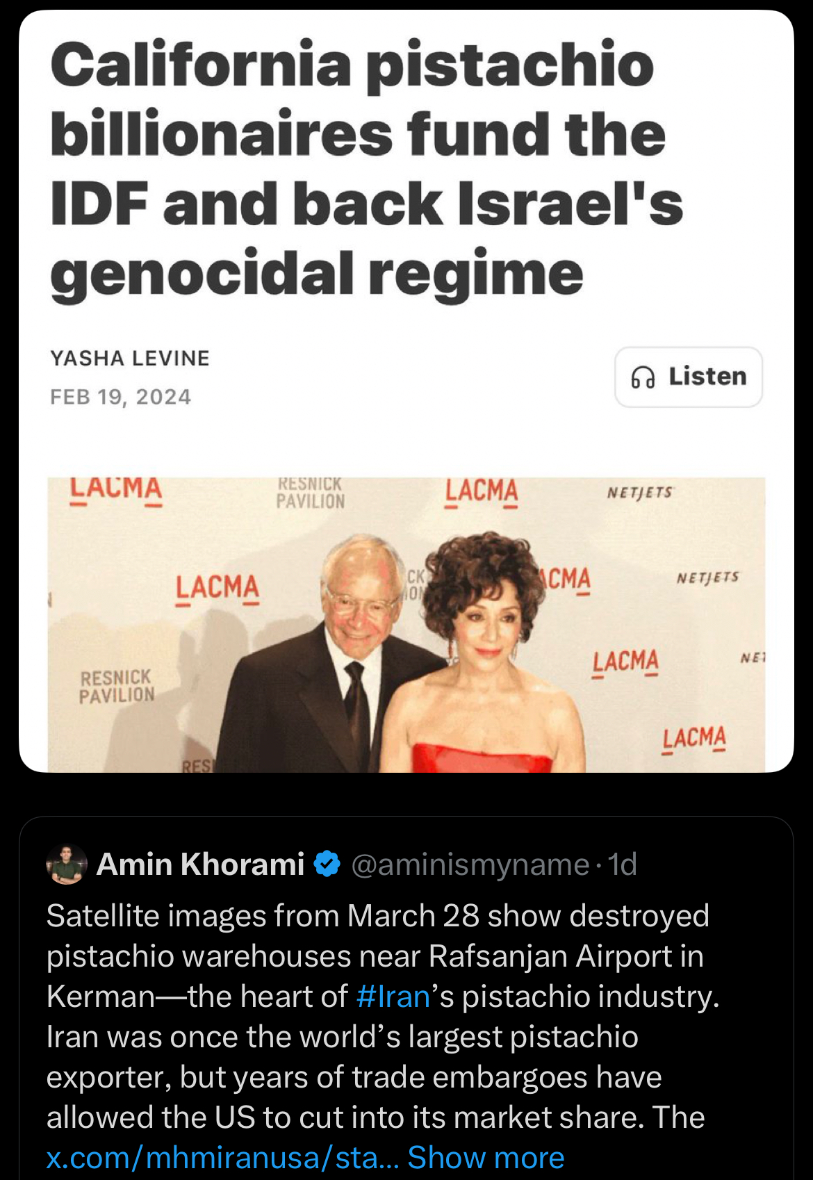 >>532629586Chechens, who are Sunni Muslims, have announced that they are going to send troops to Shia Iran and help support them during their struggle. Which is beyond unheard of as both factions of Islam hate each other with a passion. Nobody supports Israel, even if their governments do. All it takes is for mass protests across nations, blocking access to highways and ports. The world hates Israel and is warming up to Iran every hour on the hour. >>532629599Hard agreed and kek.