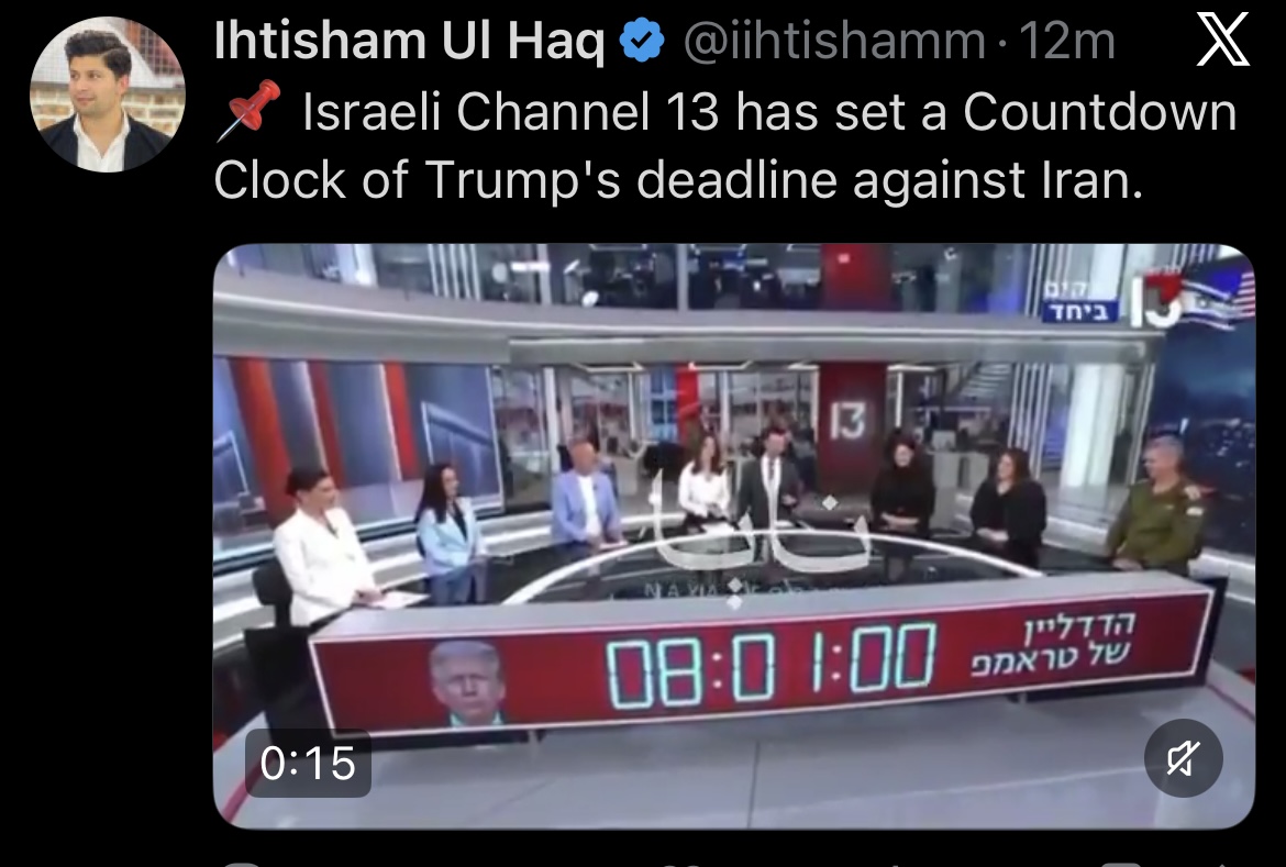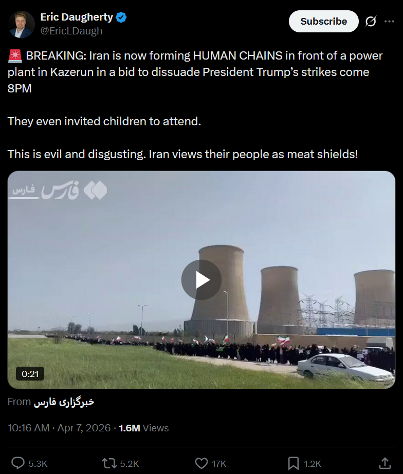 Prev #759: >>532625901Trump Ultimatum: 7h35m▶RECENT:>IRGC: will respond outside region, deprive US, allies of oil & gas "for many years" if red lines crossed, civilian facilities attacked.>President of the USA threatens to end Iranian civilisation>Iran to UNESCO: Condemn threat to attack railway recognised as World Heritage site.>USG-Israel strike railway lines and bridges in Iran & Kharg Island>Sirens and alerts in Bahrain and UAE.>Senator Tom Cotton announces Arkansas’ 142nd Field Artillery Brigade is deploying to the Middle East.>Iranian missile launches to Negev, southern Israel.>King Fahd Causeway, connecting Bahrain and Saudi Arabia, seems to be closed for traffic, according to Google Maps.>Massive US/Israeli airstrikes on Mehrabad International Airport in western Tehran, Iran.>Saudi Basic Industries Corporation (SABIC), world’s 4th largest petrochemical company, struck by Iranian missiles.▶Day 40>Trump praises Allah (on Easter of all days) and "delays" his ultimatum a 5th time, to 7 April, 8 pm EST. (Truth Social).▶WARNING:>Do not trust any "happenings" without link/proof>Uкraine / Russia discussions belong in uнg or cнug▶Oil:>https://oilprice.com/oil-price-charts/>WTI $117.55>Brent Crude $111.44>Dubai Crude $128.52▶Thread Theme:https://files.catbox.moe/i4bkew.webm▶Kino:https://files.catbox.moe/20lpu8.mp4https://files.catbox.moe/jv7tdp.mp4https://files.catbox.moe/smmsfw.mp4https://files.catbox.moe/x0fbgv.mp4▶Live-streams:https://www.youtube.com/watch?v=VehGieRi72whttps://www.youtube.com/watch?v=TdcrT5OcS9chttps://www.youtube.com/watch?v=53G-Oy4r6M4▶Telegram channelshttps://rentry.org/tgnews▶Israel Rocket Alertshttps://www.tzevaadom.co.il/en/▶Air Traffichttps://www.flightradar24.com/https://flightaware.com/livehttps://globe.adsbexchange.com/▶Maritime Traffichttps://www.marinetraffic.com/https://www.vesselfinder.com/