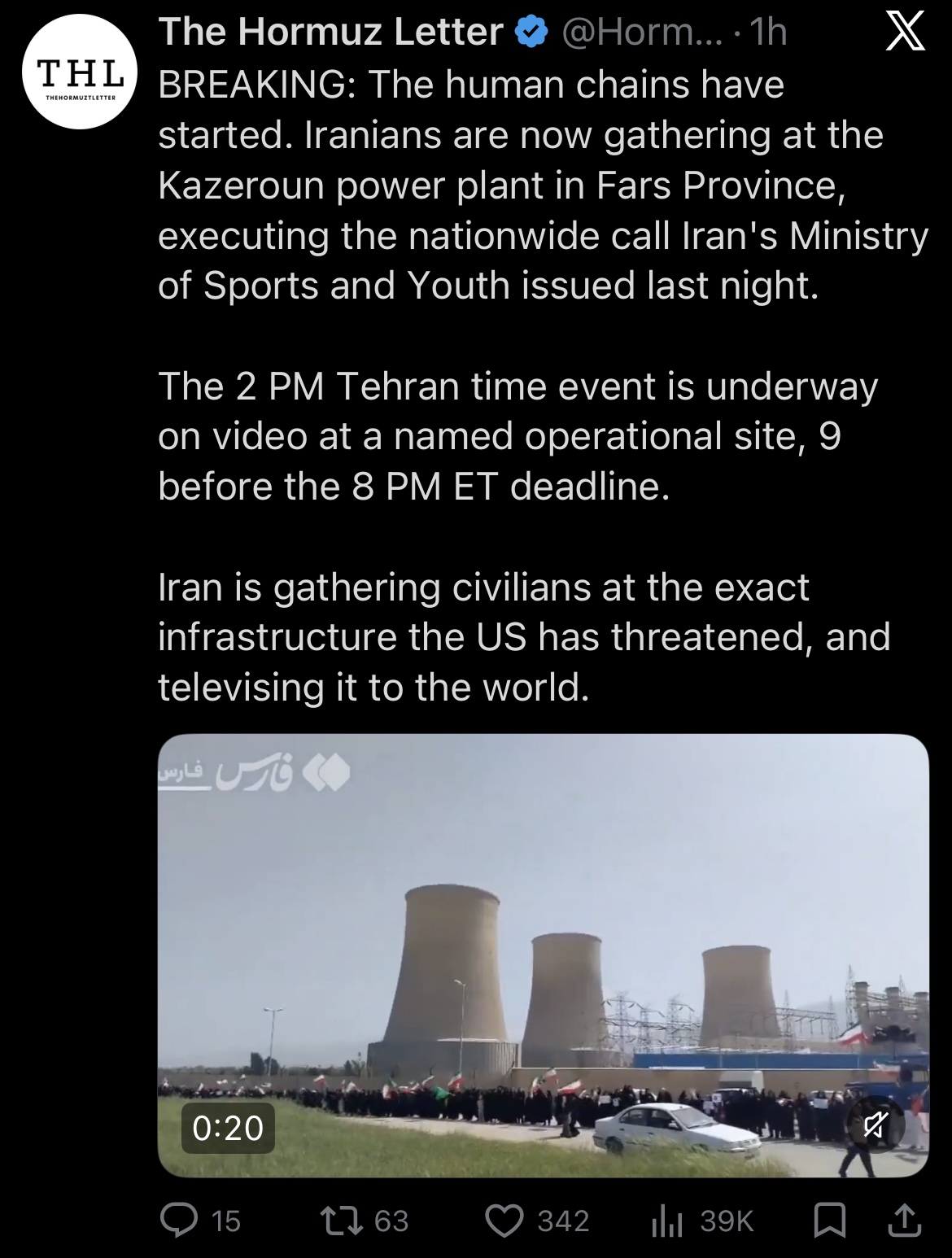 >>532629726>the hopium cope is that he TACOs? irannies are forming human chains around nuclear reactors, which makes for an extra juicy target. it would be silly to presume that they won't get bombed really hard tonight.no anon, the hopium is that the US indeed attacks civilian power plants, killing normies holding up picrel. This will further cement the position and reputation of the US in the world but will actually not lead to an immediate cessation of power. On the other hand, this absolutely will lead to Israel's power grid being targeted and the energy and IT infra in the GCC countries being targeted as well. All this, the hopium goes, will provoke a massive economic crisis and serve as a body blow to the petrodollar and the reserve currency status of the USD. Hope and change, anon.