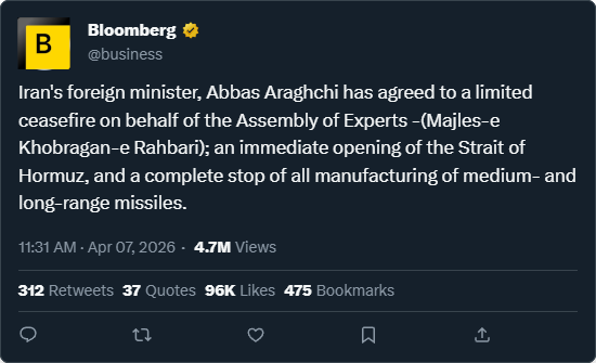 DO NOT BELIEVE CLAIMS WITHOUT SOURCEShttps://www.bloomberg.com/news/live-blog/2026-04-07/iran-latest-trump-hormuz-threats-deadline-middle-east-conflict-oil-marketsNEITHER BLOOMBERG, REUTERS NO IRAN DID SAY NEGOTIATIONS ARE ONGOING