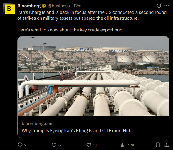 >>532629684>but maybe kharg invasion with sick drone kinolol... still hoping for that? why would we do that when kharg can be disabled from the air with ease. turn your brain on. the only reason iran is allowed to export oil still is because we are allowing them to. kharg was always a distraction as far as ground troops because that would be retarded. we can put it out of commission with a single missile strike.