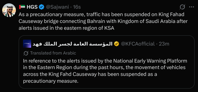 > Traffic on the King Fahd Bridge, which connects Saudi Arabia and Bahrain, has been suspended due to Iranian missile strikes.https://t.me/rasedal3ado138e/341390IRAN DID ITTHEY BOMBED THE BRIDGE Greater Persia is at hand.