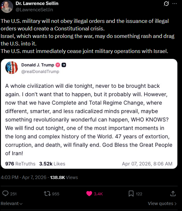 Prev: >>532625901Trump Ultimatum: 7h45m▶RECENT:>IRGC: will respond outside region, deprive US, allies of oil & gas "for many years" if red lines crossed, civilian facilities attacked.>President of the USA threatens to end Iranian civilisation>Iran to UNESCO: Condemn threat to attack railway recognised as World Heritage site.>USG-Israel strike railway lines and bridges in Iran & Kharg Island>Sirens and alerts in Bahrain and UAE.>Senator Tom Cotton announces Arkansas’ 142nd Field Artillery Brigade is deploying to the Middle East.>Iranian missile launches to Negev, southern Israel.>King Fahd Causeway, connecting Bahrain and Saudi Arabia, seems to be closed for traffic, according to Google Maps.>Massive US/Israeli airstrikes on Mehrabad International Airport in western Tehran, Iran.>Saudi Basic Industries Corporation (SABIC), world’s 4th largest petrochemical company, struck by Iranian missiles.▶Day 40>Trump praises Allah (on Easter of all days) and "delays" his ultimatum a 5th time, to 7 April, 8 pm EST. (Truth Social).▶WARNING:>Do not trust any "happenings" without link/proof>Uкraine / Russia discussions belong in uнg or cнug▶Oil:>https://oilprice.com/oil-price-charts/>WTI $117.55>Brent Crude $111.44>Dubai Crude $128.52▶Thread Theme:https://files.catbox.moe/i4bkew.webm▶Kino:https://files.catbox.moe/20lpu8.mp4https://files.catbox.moe/jv7tdp.mp4https://files.catbox.moe/smmsfw.mp4https://files.catbox.moe/x0fbgv.mp4▶Live-streams:https://www.youtube.com/watch?v=VehGieRi72w https://www.youtube.com/watch?v=TdcrT5OcS9c https://www.youtube.com/watch?v=53G-Oy4r6M4 ▶Telegram channelshttps://rentry.org/tgnews▶Israel Rocket Alertshttps://www.tzevaadom.co.il/en/▶Air Traffichttps://www.flightradar24.com/https://flightaware.com/livehttps://globe.adsbexchange.com/▶Maritime Traffichttps://www.marinetraffic.com/https://www.vesselfinder.com/