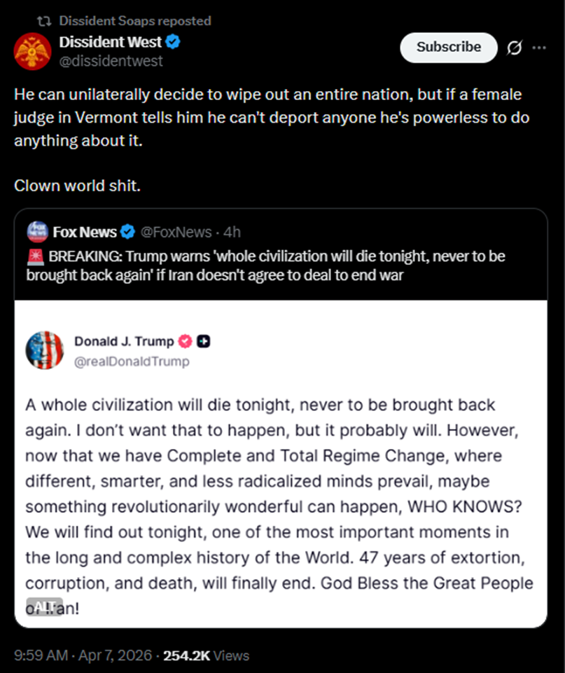They plan to do to the cultural nation of Iran the same thing that these cultureless colonialists once did to Germany. Mindless destruction. A crime against humanity.Only someone who is themselves free of a historically grown and deeply rooted civilization can openly propagate the death "of an entire civilization."Cultural peoples like us Europeans, but also the Chinese, would never act in such a depraved manner. Especially not toward a distant adversary who is far, far away, without any lifeworld points of connection and without any immediate benefit accruing to their own American people from it.Europe must finally free themselves from the stranglehold of this hegemon. Only then can we survive as a European civilization. Our future does not lie in the US-dominated, anti-civilizational "West," but in a sovereign European greater space as a cultural and civilizational power. The USA is a historical anomaly and mistake.