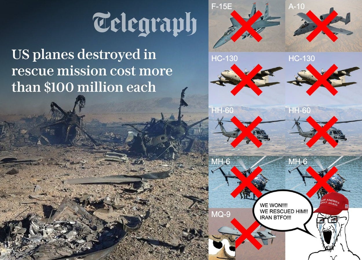 does anyone have any pics of dead zog bots in Iran? the telegram chat im in said over 30 delta force were killed trying to fake save that pilot. anyone have any pics? im getting kinda confused.