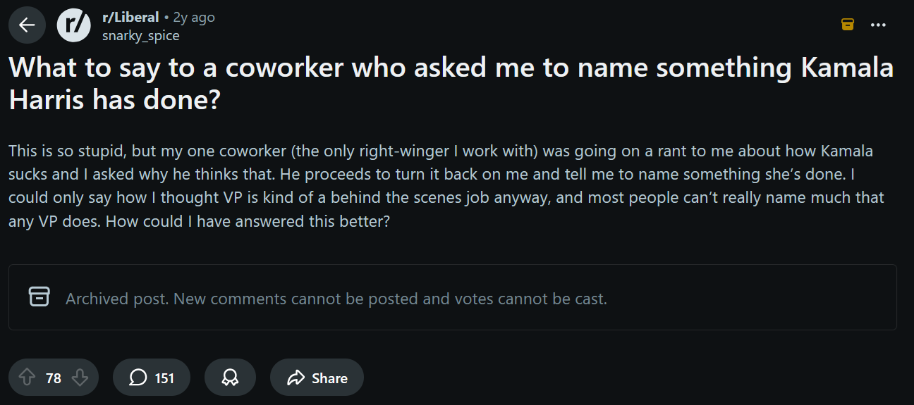 >>532637098lol that second poster was crowdsourcing an elevator comeback after her coworker won an argument with her about Kamala Harris. Redditors are sad creatures.
