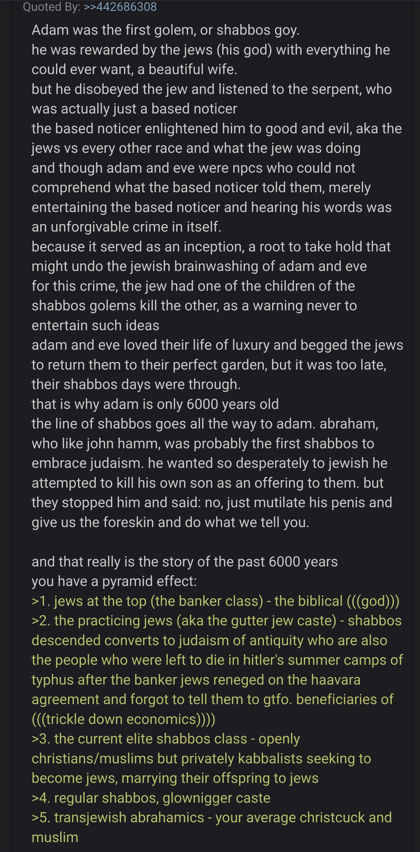>>532650766reddit is a jewish site, run by jewish normies, for normies4chan is a jewish site, run by smarter jews who arent normies, for non normiesin the beginning, jews shilled jewsus. jews had automated chatbots which obligatorily spammed national socialism threads, only to insert christianity. we call this the turkroach approach. almost everything jews do here is designed to circle you back to towards jew worshipon reddit, they associate loving niggers, trannies, immigrants and other reddit policies, with the 'side' who thinks christianity bad. so if/when one overcomes the reddit brainwashing, they immediately opt for christianity, or conservatism, or whatever. theyre playing both sides. everythings intended to circle you back to jew worship in the event it failshere, they just outright have turkroaches and levi jensens, spamming thousands of threads, thousands of identical comments, promoting christianity. but anons are too smart for jewish games. theyve seen them all. they see them every single day, whereas most normal people only experience them a handful of times.so naturally it begs the question, why do jews have such a vested interest in promoting christianity to anons? even on other boards, its hermeticism, gnosticism, or christianity, and rarely, even islam. always on the abrahamic reservation. always accepting the fundamental premise jews were chosen and the jew god yahweh is the supreme godnaturally people start to notice. thou shalt not kill, resist not evil, welcome in the foreigner, do not resist tyrants, always pay your taxes and (((debts))), if jews provide you their spiritual blessings you owe them your material blessings. gee, i wonder what the incentive is? and you really dont need to look beyond that, but you can. and a simple look at the record will tell you that christianity is the single greatest thing that ever happened for jews, and is the sole reason theyre still alive. it provides jews an easy way to blend in too.