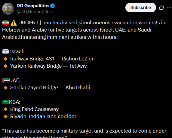 >Iran issues strike warnings for Israel rail hubs, Bahrain-KSA bridge, UAE bridge