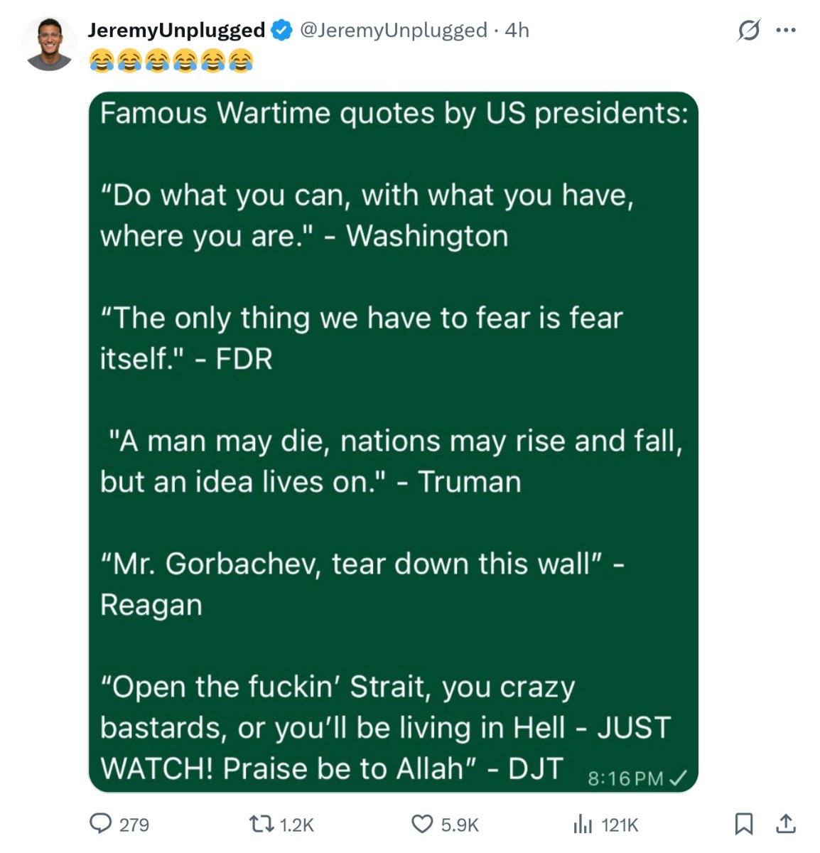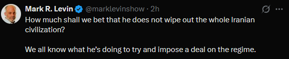 >Trump praises Allah (on Easter of all days) and "delays" his ultimatum a 5th time, to 7 April, 8 pm EST. (Truth Social).