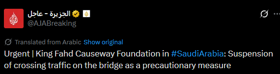 >King Fahd Causeway, connecting Bahrain and Saudi Arabia, seems to be closed for traffic, according to Google Maps.
