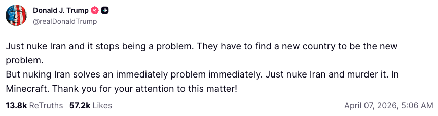 >iran has been nuked>iran hasn't not been nuked>i will nuke iran in 2 weeks>pakistan will nuke iran>iran will nuke usNothing makes sense anymore