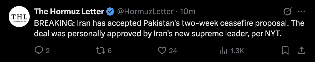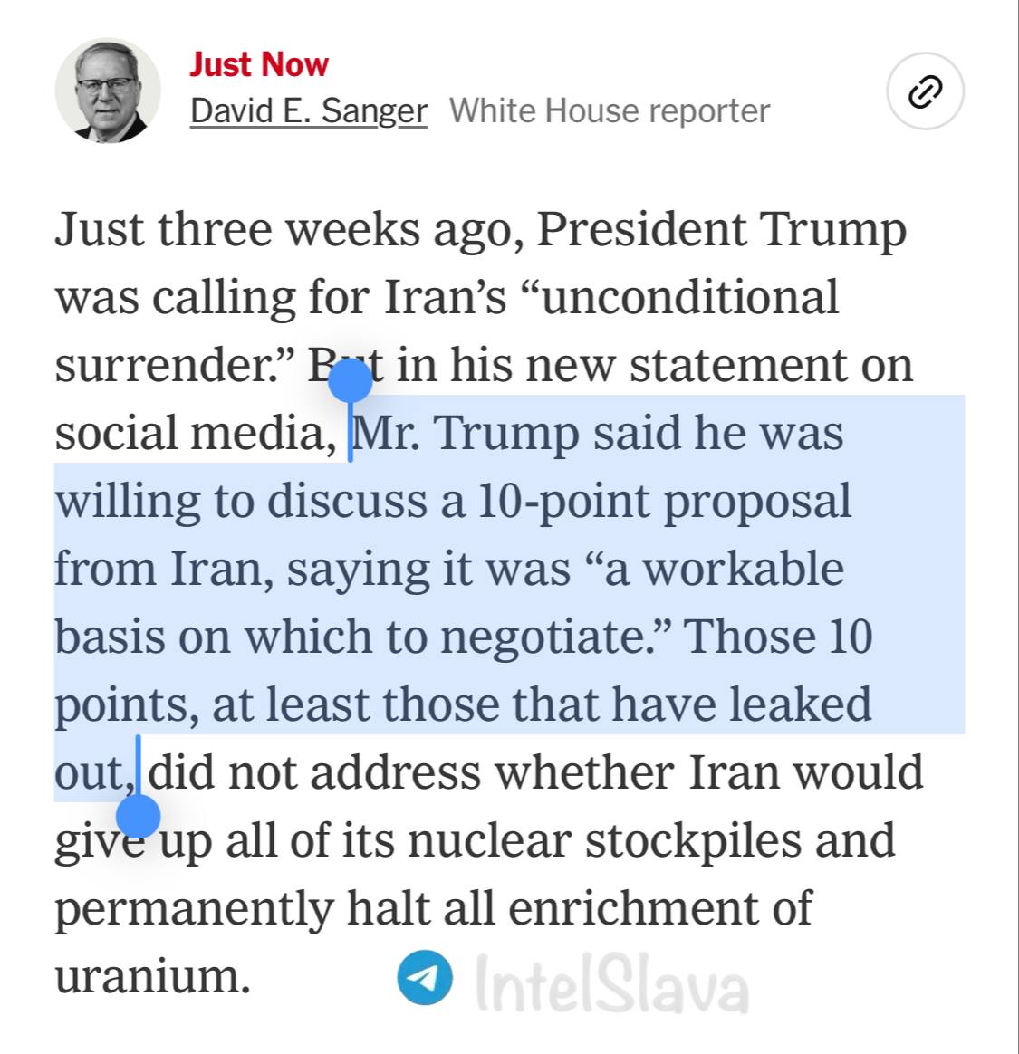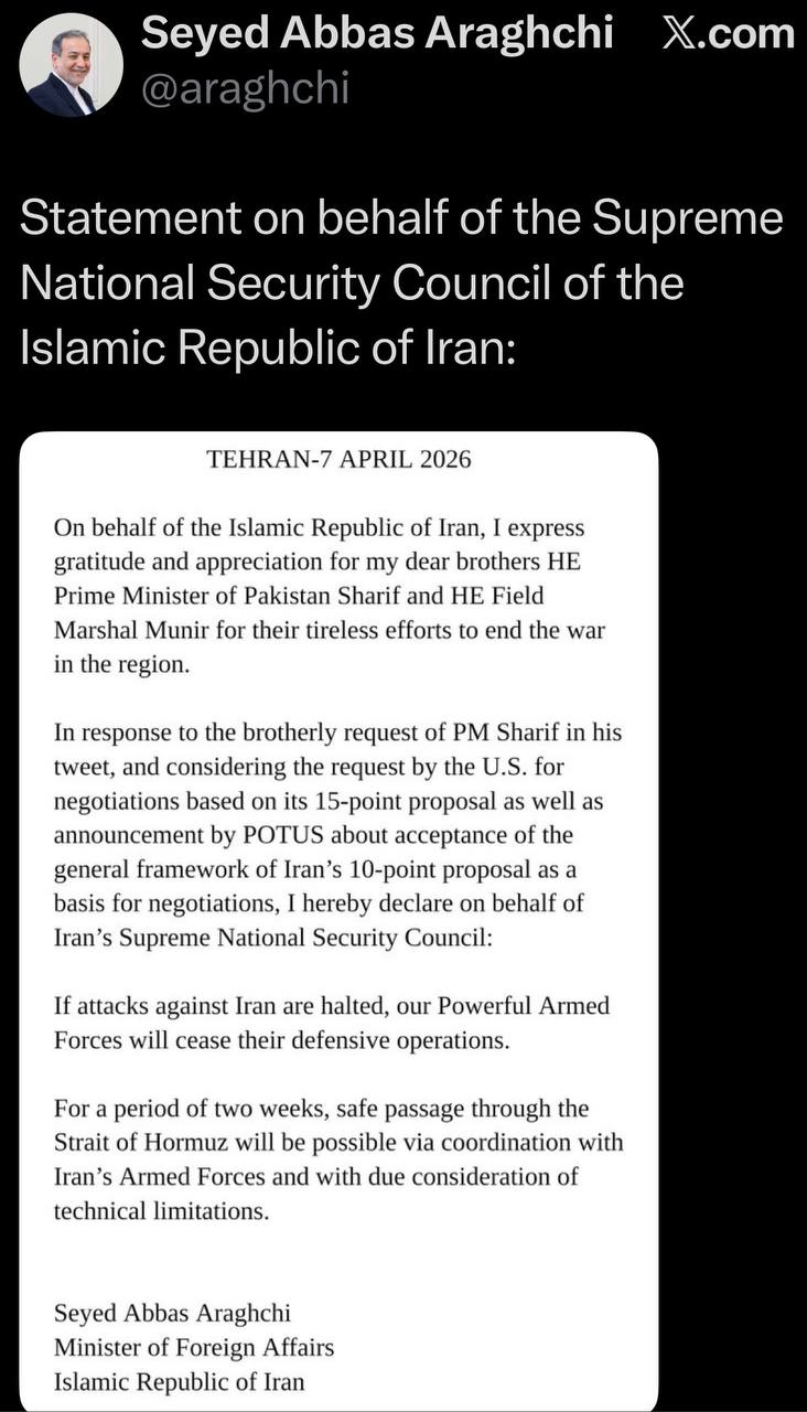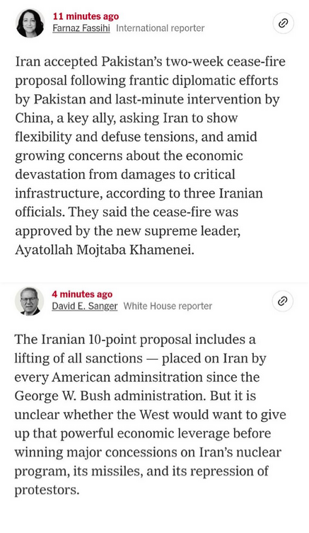 In Iran's 10 point plan:>No future aggression>Iran keeps control of the Strait of Hormuz>Acceptance of uranium enrichment>All sanctions lifted>U.S. forces withdraw from the region>Compensation paid to Iran>War ends on all frontsThey're about to find out Trump's wordsmean nothing. Or a major timeline shift just happened.