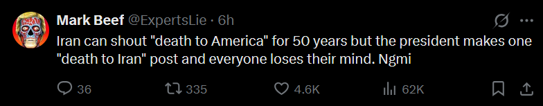>Iran deal reachedLeftists fell for it again award.Orange man wins as usual.Trannys seethe (and dilate furiously).Nick Fuentes donos in free fall.Tucker looks like a bitch for panicking over nothing.Hassan Piker crash out.Saudis will sign Isreal deal.Trump gets his peace nobel prize.Mass leftist suicide hanging themselves with their Pali larper scarf as AI Netanyahu drinks a latte inside Mecca and declares Gaza a new resort townRemember: You Lost, Tranny (3 more years too!)