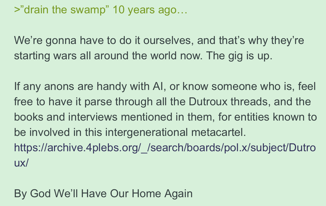 >>532660983>>532661655Because this war isn't really about the Ayatollah or the Iranian people or even oil, it's about grinding the Chinese empire to dust while using that dissolution to fuel retrenchment of the American Empire, which of course impacts the entire world because we have ruled the world since 1945. The most important aspect of this retrenchment is renegotiating the three pillars of the New World Order: Bretton-Woods, International Law, and the perpetual existence of pariah-state boogeyman nations. The first is the most important of the three. In order to renegotiate Bretton-Woods you have to spend the entire petrodollar-based global economic system which has been in place for a half-century. This is creative destruction of historical import, which will reshape the geopolitical landscape for the rest of the century at least