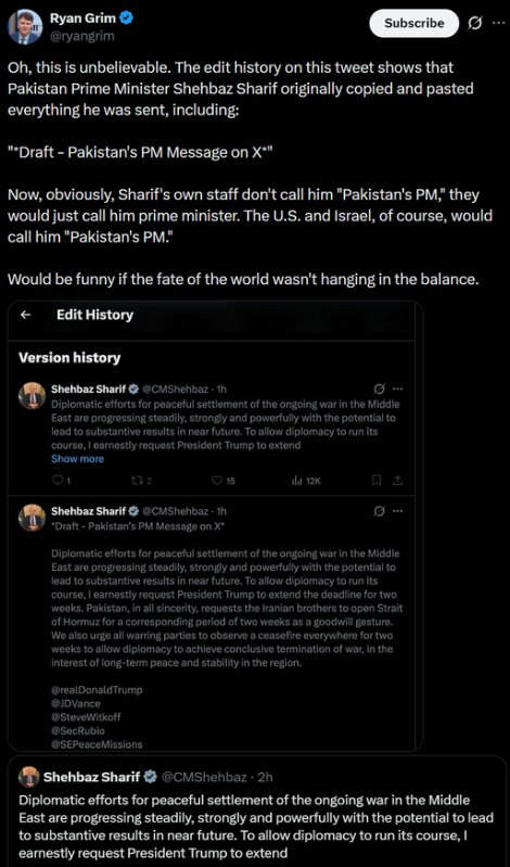 >>532657600Pakistan said one thing repeating the shit they've been saying this whole war (they are cowards who don't want to honor their deal with the Arabs). This means desperate Iranian shills now are clinging to this hoping their regime doesn't get changed. They are very desperate.