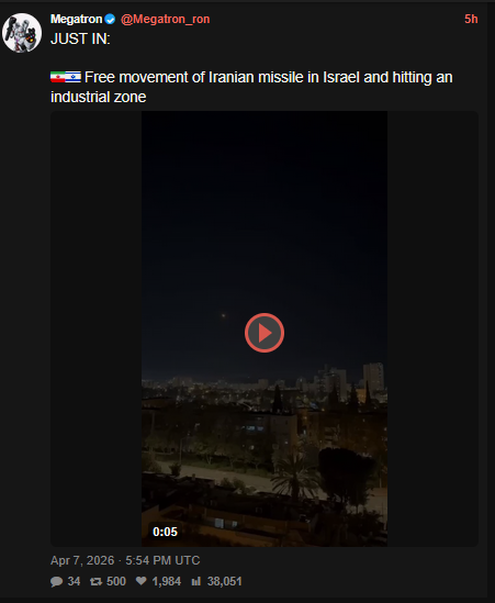 iranian missile hitting industrial zone without interceptors https://xcancel.com/Megatron_ron/status/2041575416474038405#m