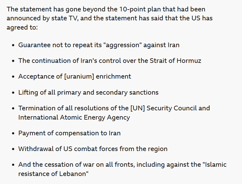 the US agreed to work out from Iran's 10 point peace plan, so negotiating on their terms, don't know how you can call that a victory, but you're experts at gaslighting yourselves so go right ahead