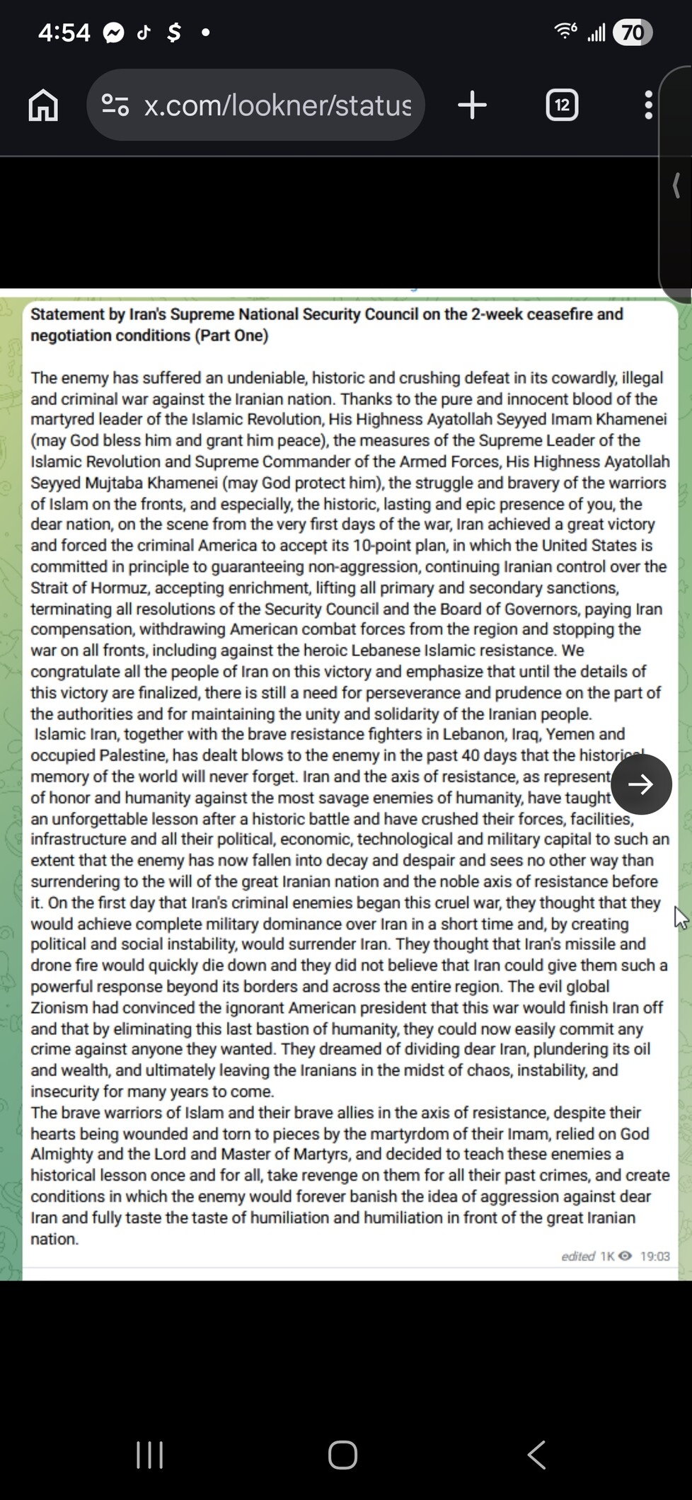 Here's what the Iranian side is saying Trump has accepted in principle:• Security guarantees against future attacks on Iran• Iranian military control over the Strait of Hormuz• Lifting of all sanctions• Ending all Security Council resolutions against Iran• Acceptance of Iranian uranium enrichment• A withdrawal of all US forces from the region• A total discontinuation of attacks against both Iran and Lebanon• "Full compensation" to Iran for the costs of the war• The release of all frozen Iranian financial assets abroad• The codification of all of the above in a UN Security Council resolutionThey say these conditions must be ratified in negotiations in Islamabad "with complete distrust of the American side" starting Friday, with a two-week deadline to conclude the negotiations, and that the war will only end when all the conditions are met.