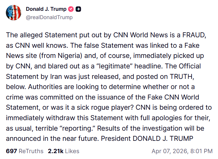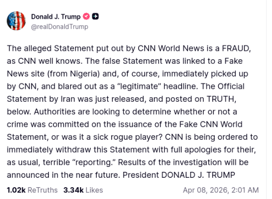 >tweetThe alleged Statement put out by CNN World News is a FRAUD, as CNN well knows. The false Statement was linked to a Fake News site (from Nigeria) and, of course, immediately picked up by CNN, and blared out as a “legitimate” headline. The Official Statement by Iran was just released, and posted on TRUTH, below. Authorities are looking to determine whether or not a crime was committed on the issuance of the Fake CNN World Statement, or was it a sick rogue player? CNN is being ordered to immediately withdraw this Statement with full apologies for their, as usual, terrible “reporting.” Results of the investigation will be announced in the near future. President DONALD J. TRUMP