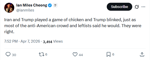 >the left is literally retreating further into fantasies about Iran winning when just this morning they were crying that Trump was going to blow up their literal baby wall of human shields.