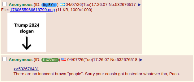 >>532676431There are no innocent brown "people". Sorry your cousin got busted or whatever tho, Paco.