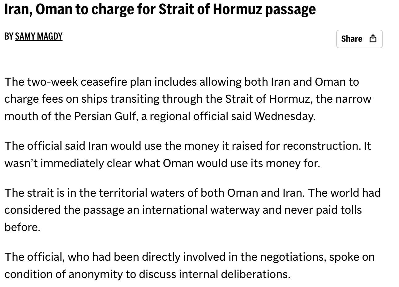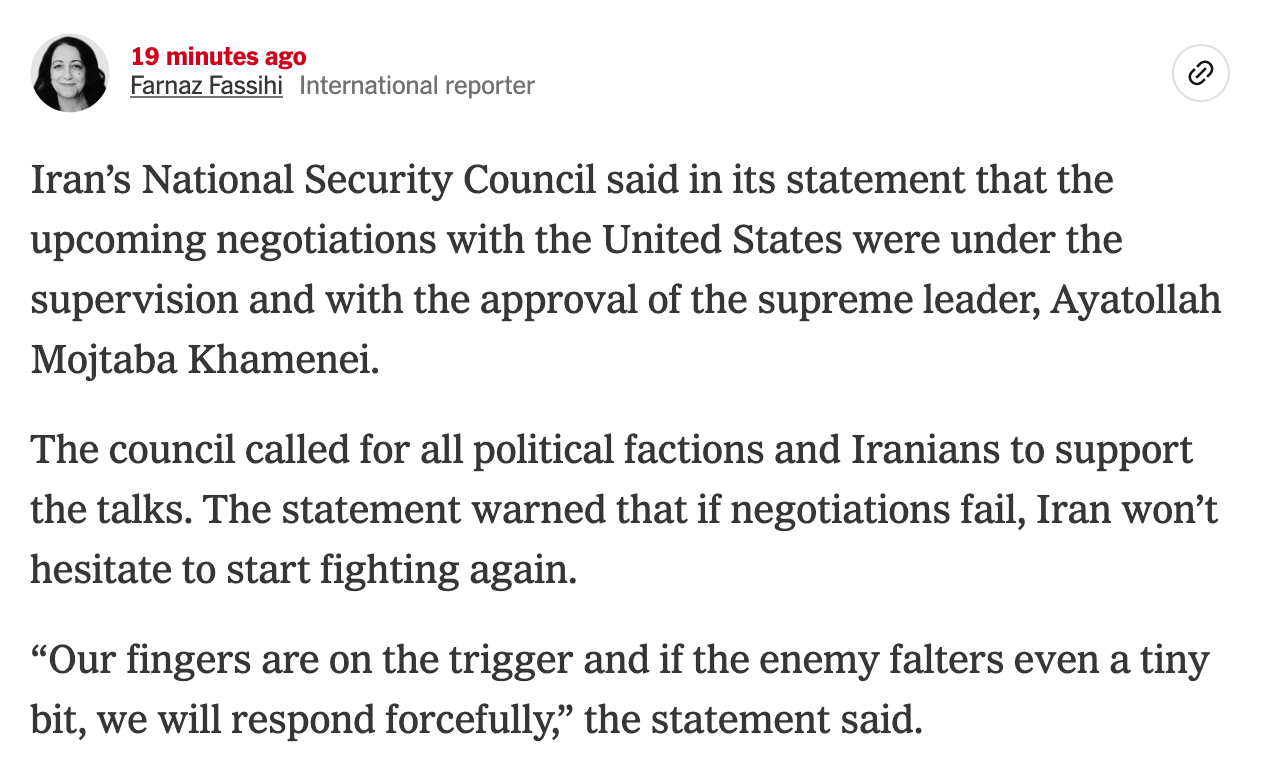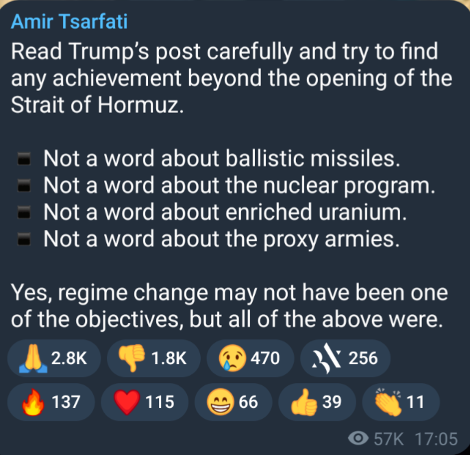 >President Trump’s words speak for themselves: this is a workable basis to negotiate, and those negotiations will continue. The truth is that President Trump and our powerful military got Iran to agree to reopening the Strait of Hormuz, and negotiations will continue.