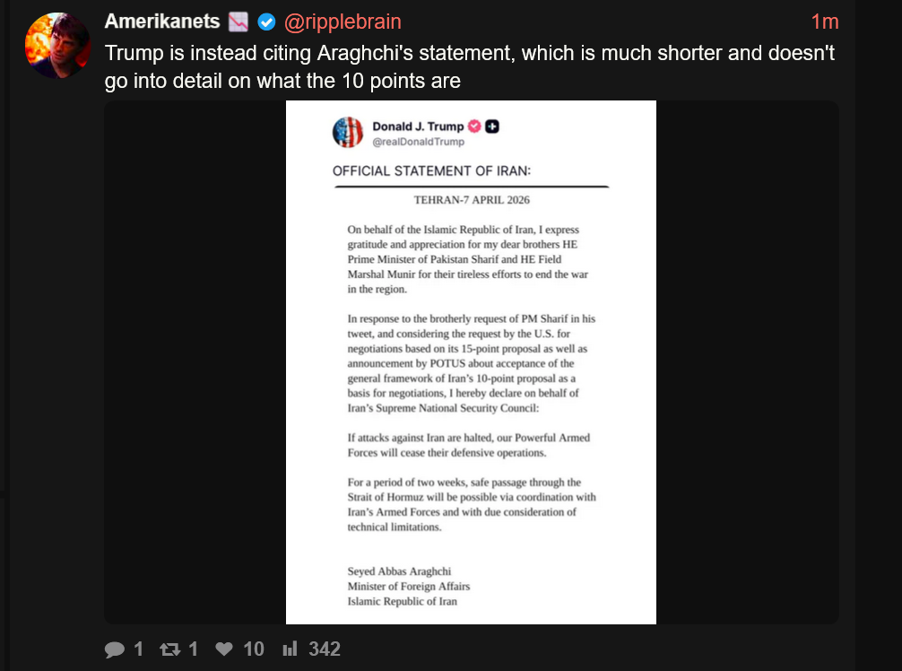 >Iran media gives different 10 point plan and, the one from yesterday and says trump agreed to everything to save face
