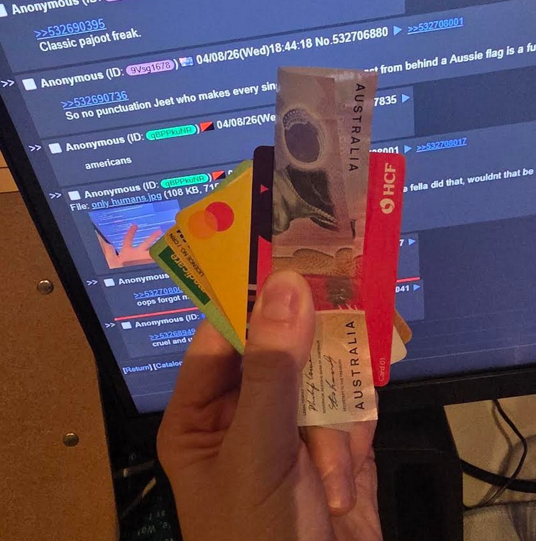 >>532708001hey isnt innit kinda funny that if you fold an aussie 5 dolla bill the right way, it looks like a whale giving a blowjob