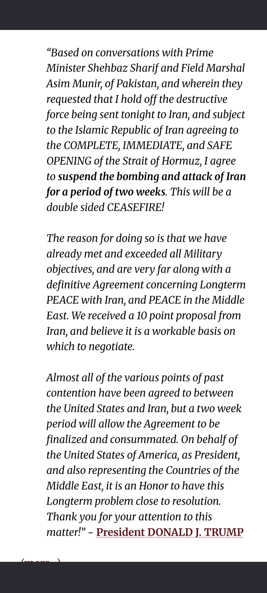Trump caved. Ceasefire on irans terms. He has two weeks to meet their 10 point plan. He will claim he got the Strait open. The Strait was already open before the war. He gained nothing and he ruined his presidency.Trump caved. Ceasefire on irans terms. He has two weeks to meet their 10 point plan. He will claim he got the Strait open. The Strait was already open before the war. He gained nothing and he ruined his presidency.