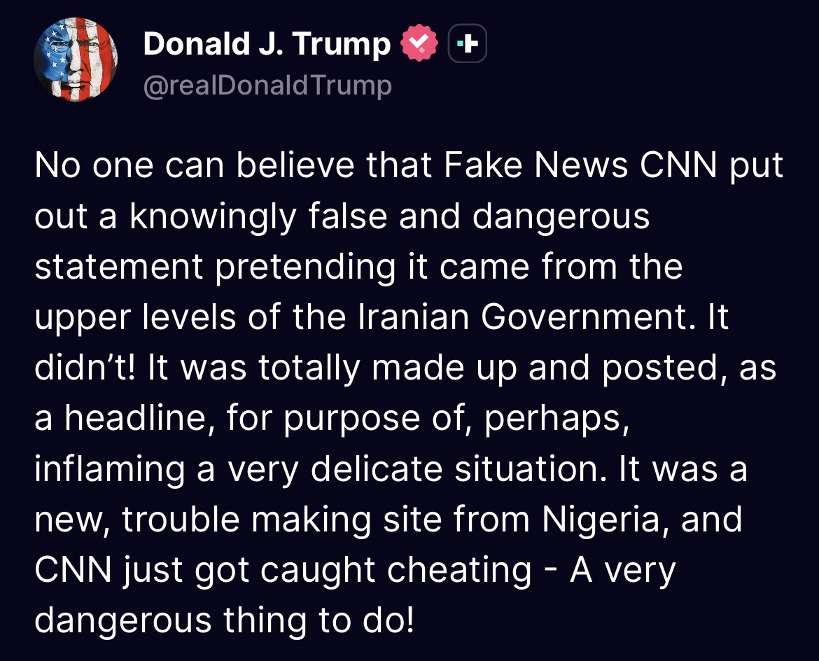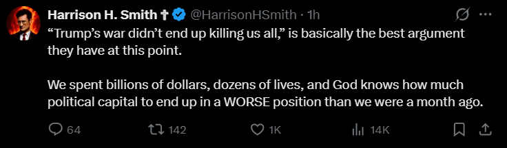 I do love that Trump is getting shit on in the replies on Truth Social. He deserves it. This is the most shameful moment of his presidency. Why the fuck would you go this far only to give in for no readily apparent reason? I understand if Iran posed a legitimate military threat but they don't. What the fuck?