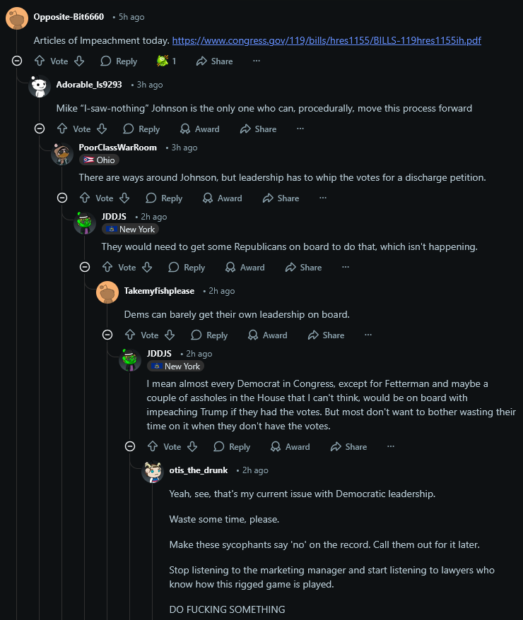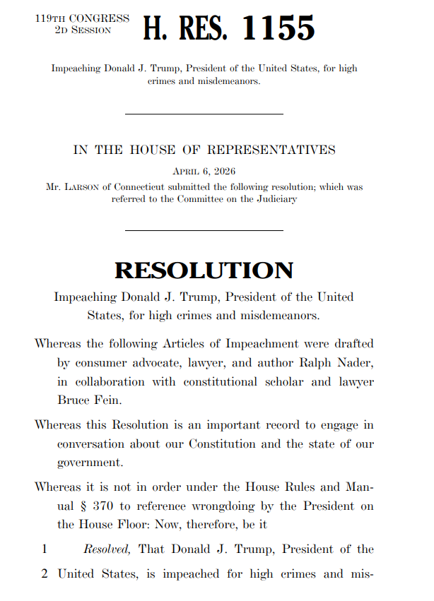 >>532692641They literally impeached Trump today. They had Ralph Nader write the impeachment. Surely this time (the ninth time they have tried it by the way) it will stickhttps://www.congress.gov/119/bills/hres1155/BILLS-119hres1155ih.pdf