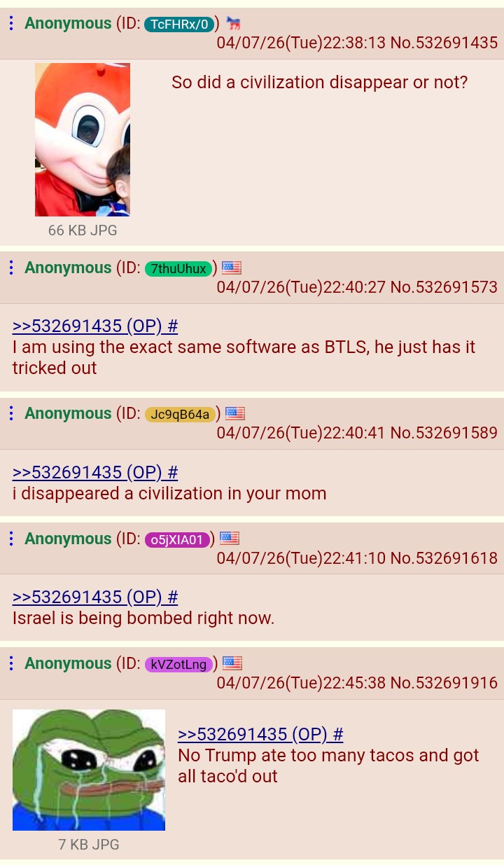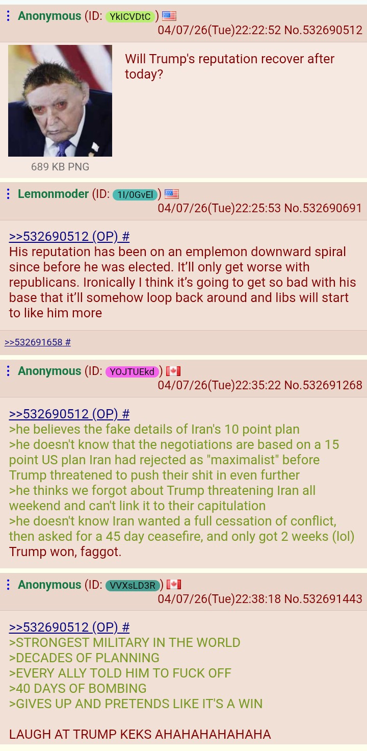 ALWAYS AWOOWE WON 2024 LOL (AND 2020)SNEED AND SEETHE SHILLSGOD PROTECT TRUMPDROP THE HAMMERSMASH THE PLACE TO PIECESPUNCH THE SCORECARDHANG THE RIGGERSJINX THE JABBERSFINISH THE WALLHOLD THE LINENEVER CONCEDEDRAIN THE SWAMPSINK THE CHINKBAN THE TRANSBE KAWAIIDEPOPULATE ELITESWE ARE SUPER ELITESIT'S OKAY TO BE WHITEJUSTICE FOR LORIKILL THE SHILLDON'T BAKE THE CAKEBE BESTHONOR ABEREMEMBER CHARLIEDEFUND THE FEDSALL FEDS ARE BASTARDS (except ICE and Border Patrol)STOMP THE TURTLESTRONGER TIMES NOWBETTER GET YOUR ACT TOGETHERLIGHT THE FUSEPLAY MINECRAFTEAT THE BURGERISRAEL IS NOT AN ALLY (except when killing Iranians!)THIS IS ULTRA MAGA COUNTRYBANKRUPT THE BANKS!WOLFGIRLS FOR TRUMPERS!DUM AND GAY IS NOT OKAYKEEP POSTING THAT FUCKING RACCOONDEPORT THE HORDE!CHRIST IS KINGALLEY CATS FOR TRUMP!FIGHT FIGHT FIGHT!TRUMP FOREVER!7/13 WAS AN INSIDE JOBBETTER WEIRD THAN QUEERALL GROYPERS ARE GAY FEDSPLUG THE LEAKERSRAKE THE LEAFSESCALATE TENSIONSMARS CHUDS UNITEHEIL SYDNEY SWEENEY'S GOOD GENESDONROE DOCTRINEUNLEASH CHANGBIG DICK BED CHEM MAGA ENERGY!>>532689792>>532689993>>532690058Good awoovening!I can't believe drumpf surrendered to Iran and we now have to learn Farsi and convert to Islam
