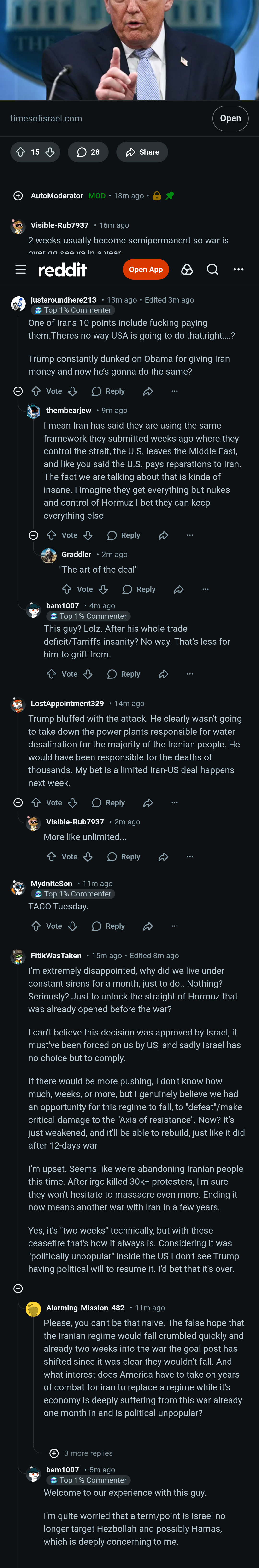 I think an important thing most people are missing is that Trump said they are starting negotiations from Iran's 10 point plan. Not American's 15 point plan, or even somewhere in the middle, but Iran's maximum demands. This is a huge position of weakness for the Americans.