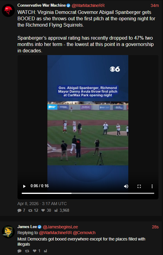 IT'S FUCKING TIME!ULTRA MAGA'S EXTREME REVENGE IS A DISH BEST SERVED COLD WITH BOTTOMLESS REFILLS SERVED BY PIERCE BROSNAN!Spanberger got booed throwing out the first pitch at the opening night for the Richmond Flying Squirrels.Maybe she shouldn't have secretly but not so secretly cheered for Peanut's death.https://nitter.net/WarMachineRR/status/2041717064444850277#m>>532692493>right there with you, maybe even a page ahead because juno was supposed to be a tomboyHollywood needs to go to tomboy school if they are gonna actually try to write a convincing tomboy character.>i also liked inception but she was easily the weakest part of thatI never really even noticed that was her but I guess that is how weak a character she was. >anyway, blur now>>532692657>based tomboy titsaverstomboys needs as much tits as they can have!(none of that fake tit shit though, that isn't tomboy, that's just cope everyone can see and really quite sad to see)