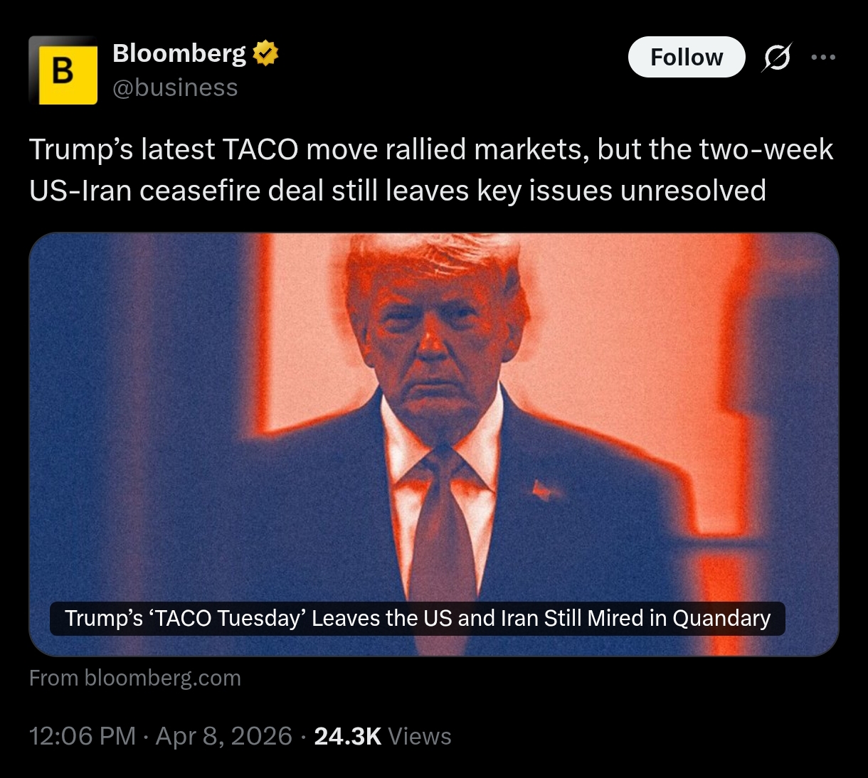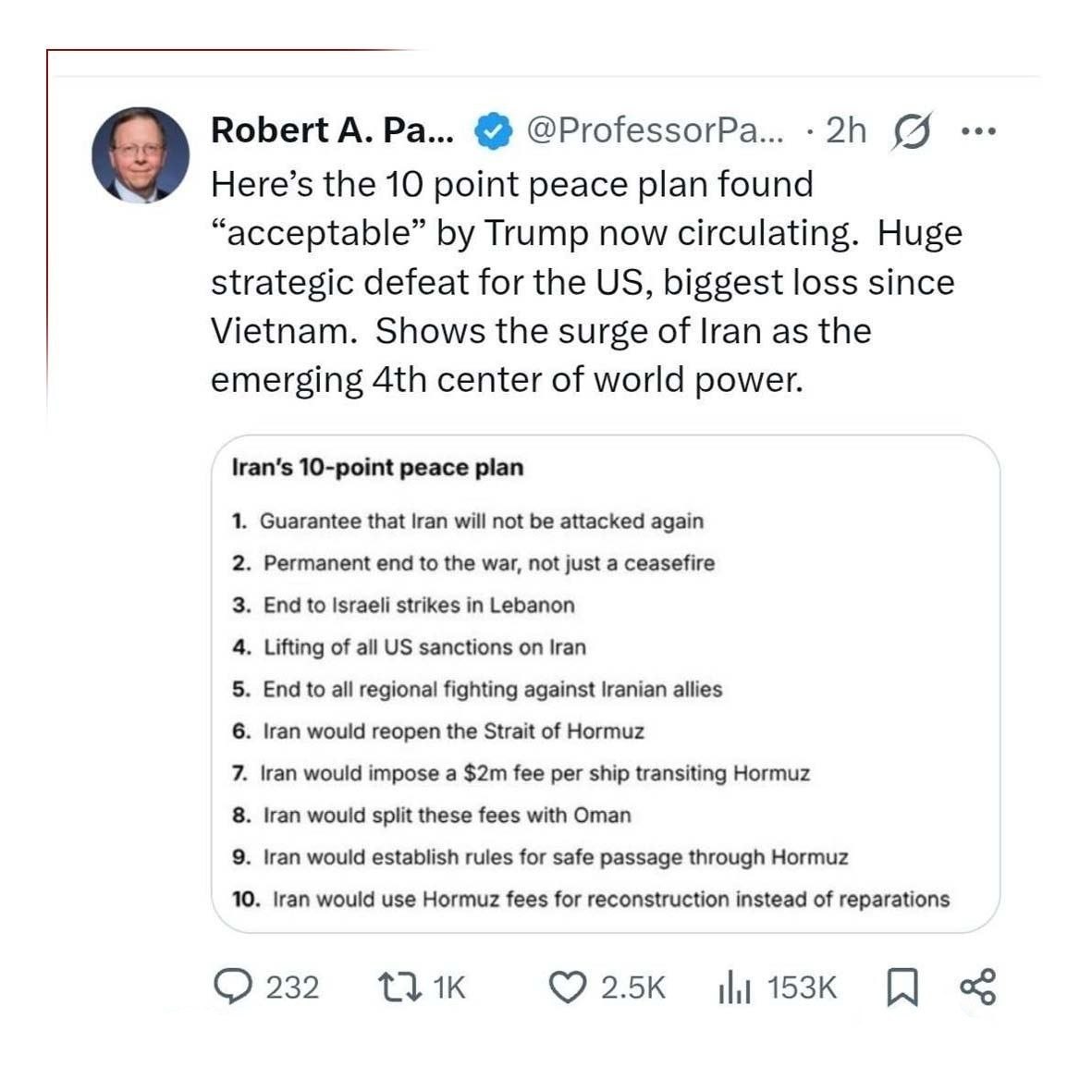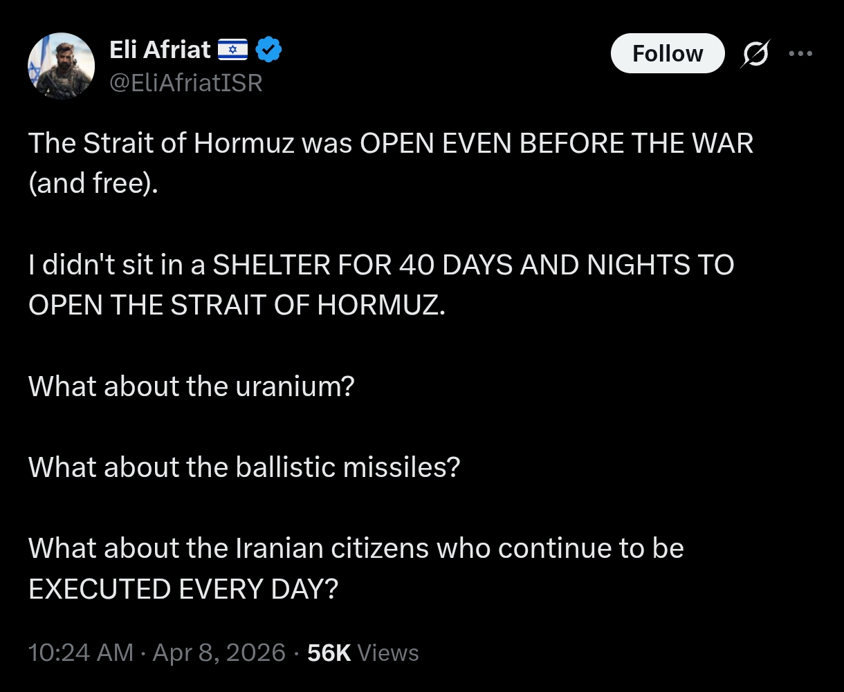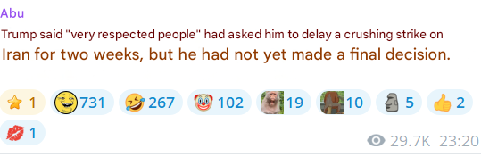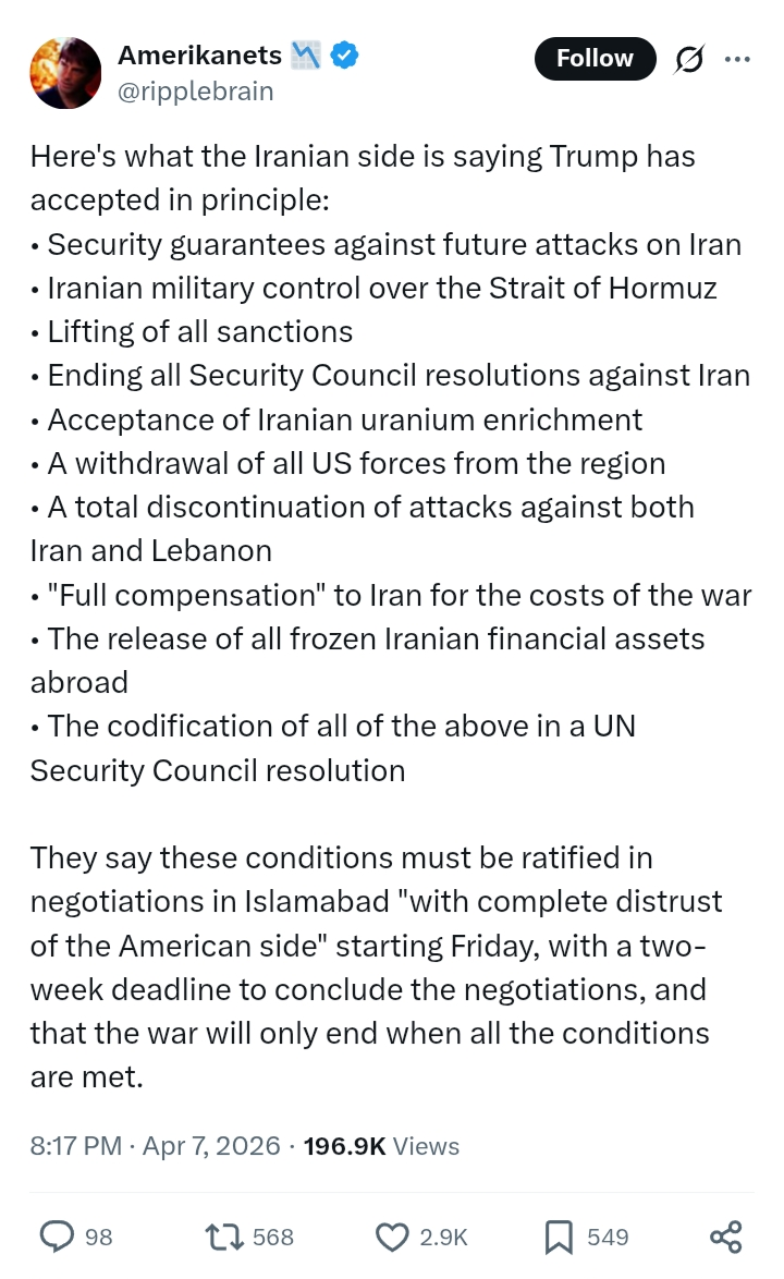 But did Iran even agree to the ceasefire. I have only seen Trump and Pakis say that's the case, no word of it from the Iranians yet as far as I can tell. And honestly, if they did agree, then they kinda deserve whatever strike the US is preparing for.