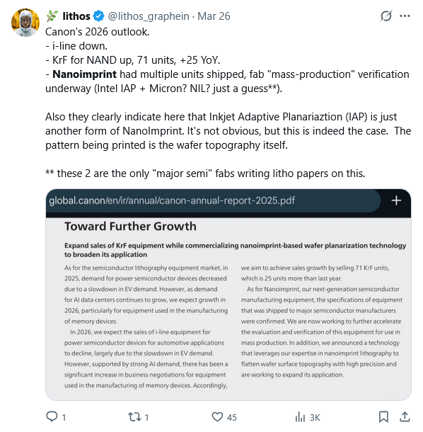 >>532705983Canon just shipped NIL to Micron and DARPA. IAP (NIL spin-off) to the Intel 14A line. Hoping it will give some blow to ASML monopoly.
