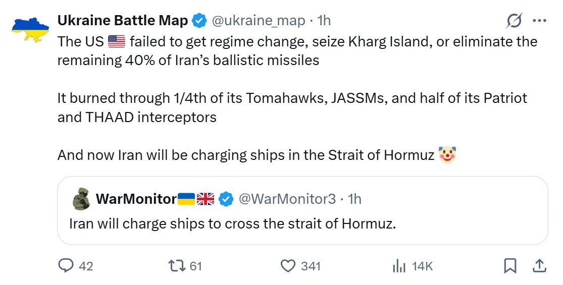 Apr 5: "Open the fuckin' Strait, you crazy bastards, or you'll be living in Hell - JUST WATCH! Praise be to Allah."