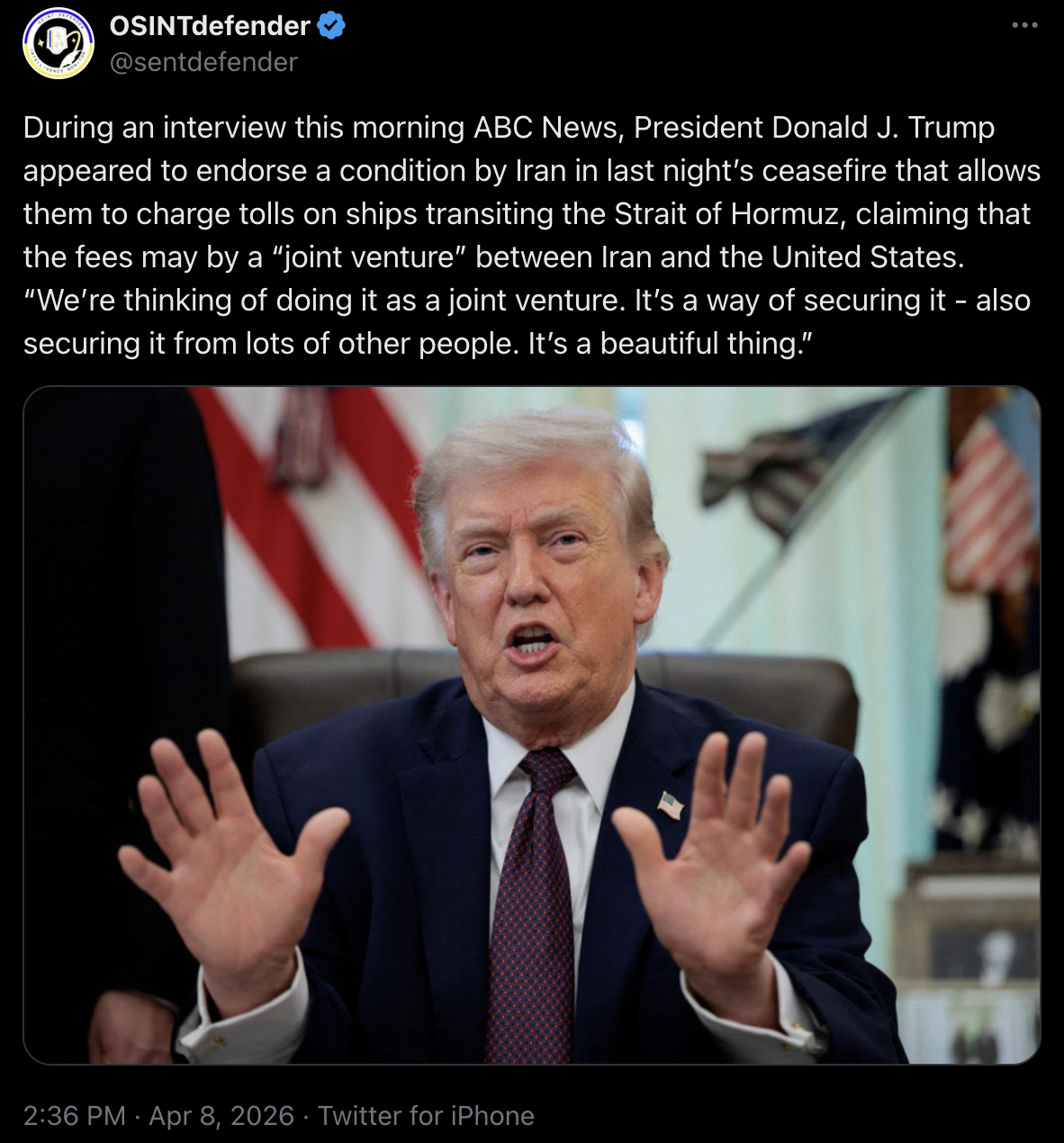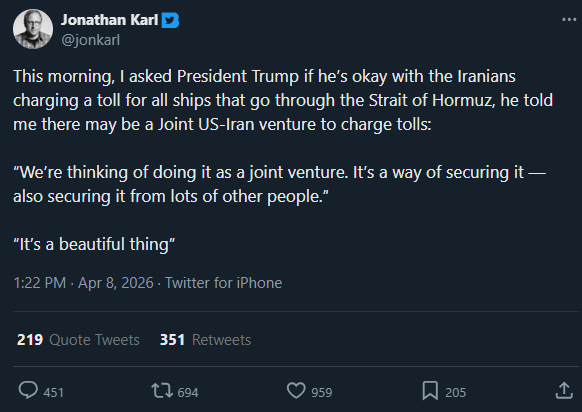 >Associated Press reports that Iran and Oman will charge tolls for all ships passing through the Strait of Hormuz as part of the two-week ceasefire plan.