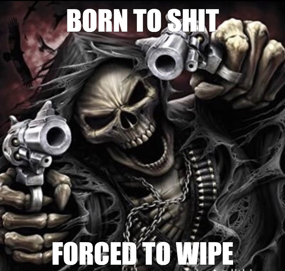 >>532734162A skull with no jaw. KSH mashed onto the forehead. Spiders for eyes. A pair of revolvers. Two random extra barrels, for some reason. And also a thompson on the back. Who designed this? This is some shit you'd see a facebook boomer posting because he's a "badass biker" whose dick doesn't work anymore.